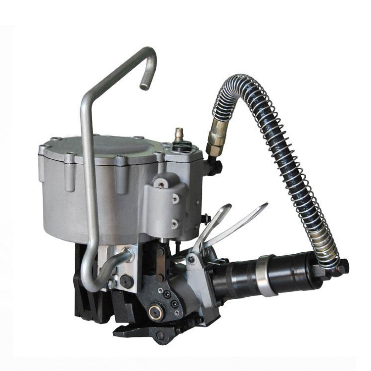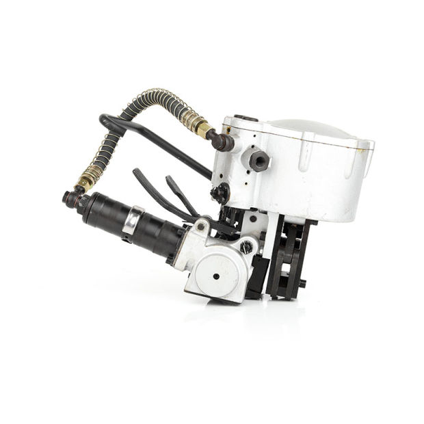 Het ergonomische en robuuste ontwerp van dit pneumatische hand omsnoeringsapparaat met wrijvingslas zorgt voor maximaal bedieningscomfort tijdens het gebruik. IHet is gemakkelijk te bedienen en als het gereedschap aan een katrol is bevestigd, kan het met één hand worden gebruikt. Een enkele duimdruk bedient het gereedschap, met spannen en verzegelen met een druk op de knop. Leg een stalen band met de aangegeven breedte rond het pakket, overlap de banden met het loden uiteinde aan de onderkant en houd de band in uw linkerhand, nadat u ervoor heeft gezorgd dat de band schoon en olievrij is, knijp in de ontgreclip op de riem en vervolgens het pneumatischendelingshendel en plaats de stalen gereedschap op de stalen clip. Verstelbare omsnoering en instelbare sealtijd zorgen ervoor dat de het apparaat vrij kan worden ingesteld voor de verschillende soorten beschikbare banden. PDruk op de spanningsknop om met spannen te beginnen zodra de gewenste spanning is bereikt, druk de knop nogmaals in om het lassen te starten. Zodra dit is gedaan, koelt het gereedschap de band af en snijdt deze af. Het omsnoeringsapparaat staalband is gebouwd om lang mee te gaan en bestand te zijn tegen het gebruik in fabrieken of magazijnen. Het omsnoeringsapparaat staalband heeft een garantie van één jaar en wordt onderhouden in de Europese Unie.