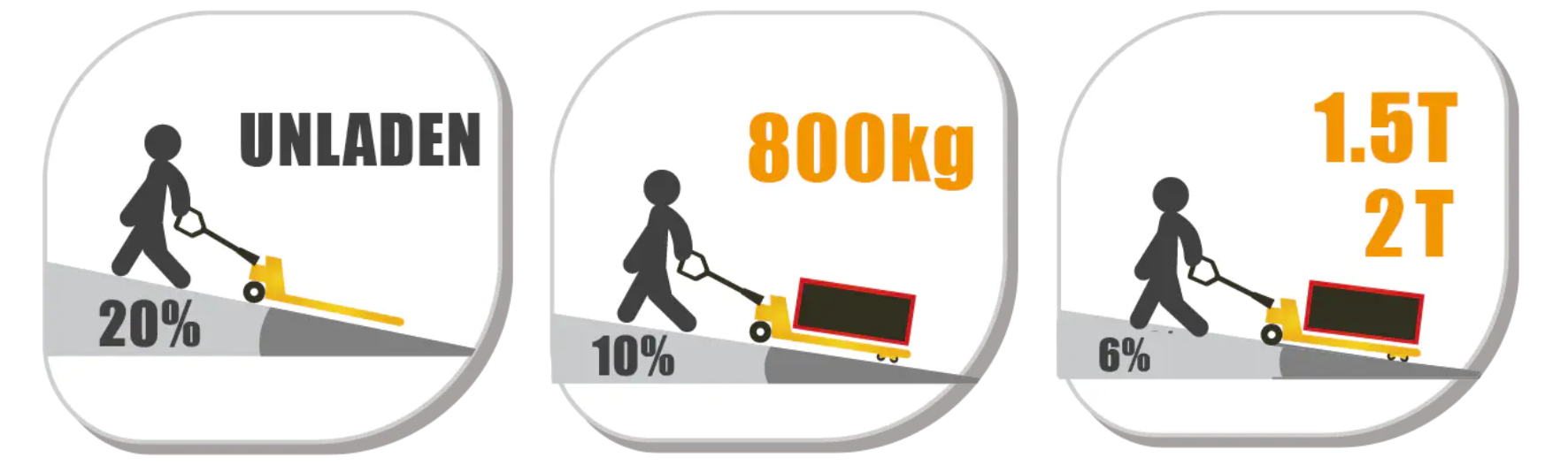 It can handle inclines of 6% to 20%, enabling use on ramps and slight slopes.