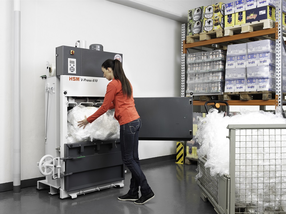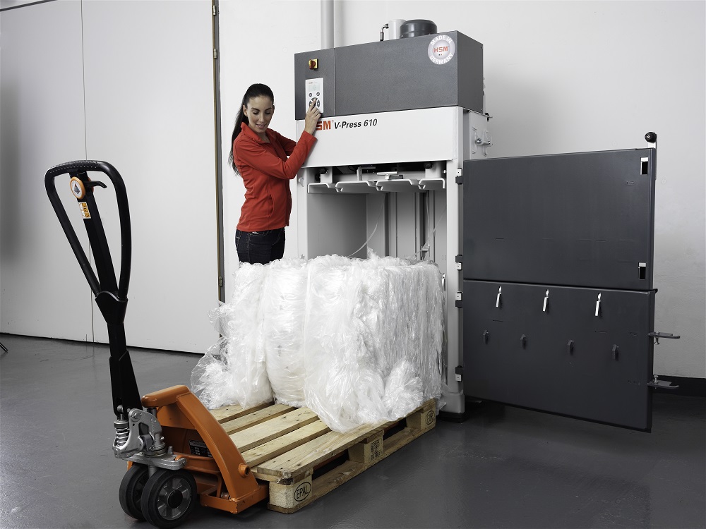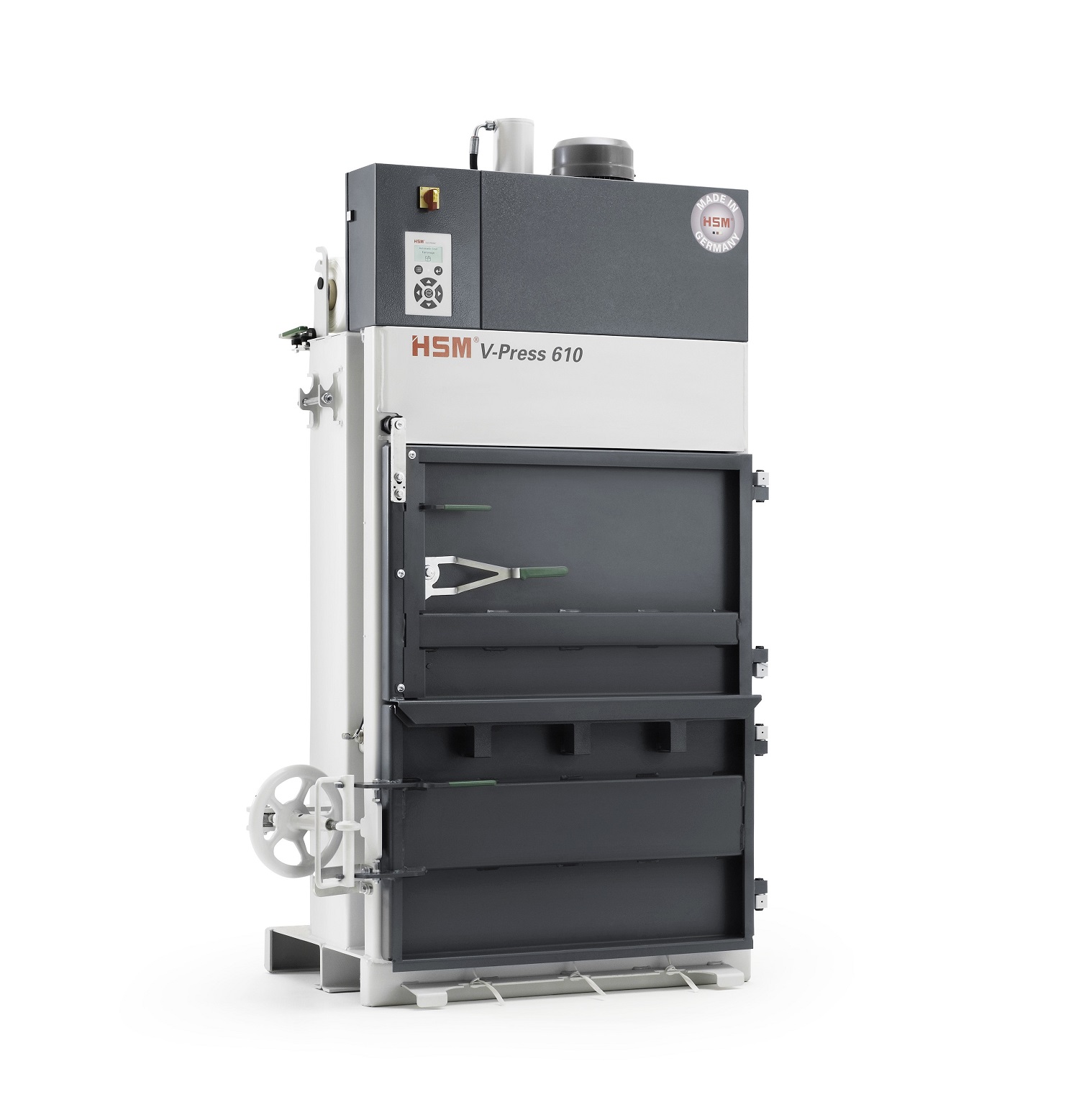 Bestel de vuilnispers HSM V-Press 610 hier in onze winkel en pers het verpakkingsvolume tot compacte balen.